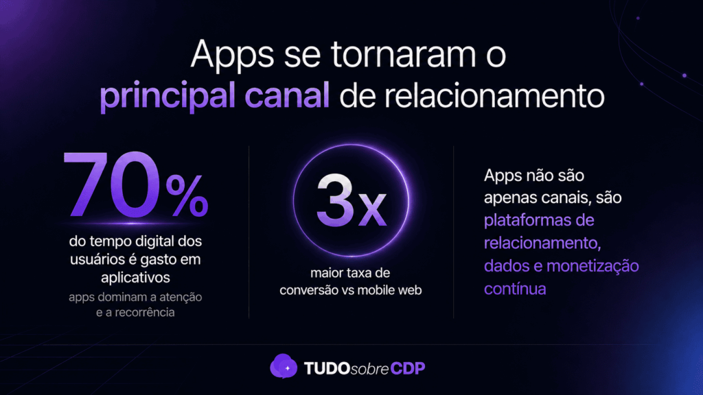 Mas o ponto mais estratégico está na diferença entre app e web. Usuários passam aproximadamente 90% do tempo em aplicativos, que podem converter até três vezes mais e gerar o dobro de recompra em comparação ao mobile web, além de serem preferidos por mais de 60% dos consumidores.